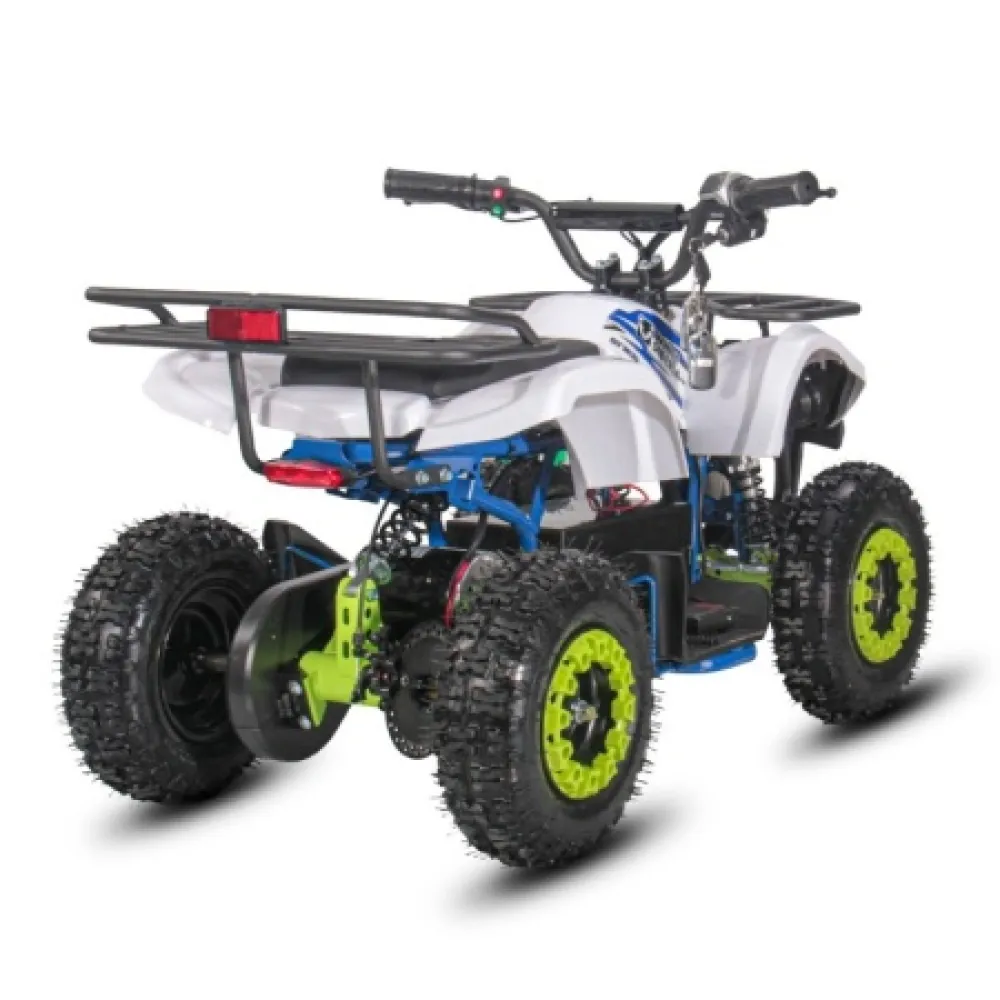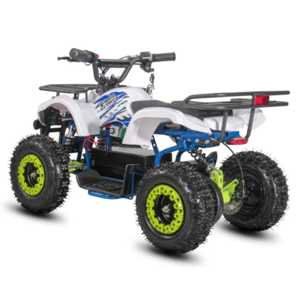 Колеса 4,1-6 (задние 10*5,00-6) вращаются свободно и имеют протекторную поверхность. Сидение правильной формы и руль гарантируют высокий комфорт езды и отсутствие ощущения усталости. Надеемся вам понравился электроквадроцикл. Для заказа свяжитесь с нашим менеджером.