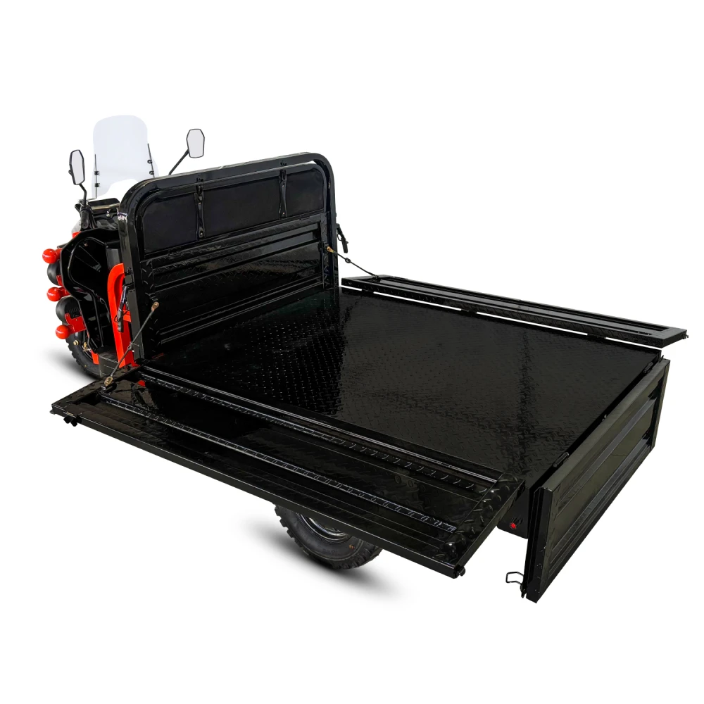 Ребристый усиленный металл, Цельные борта на всю высоту кузова. Откидные задние и боковые борта на быстросъёмных петлях, насечки внутри кузова