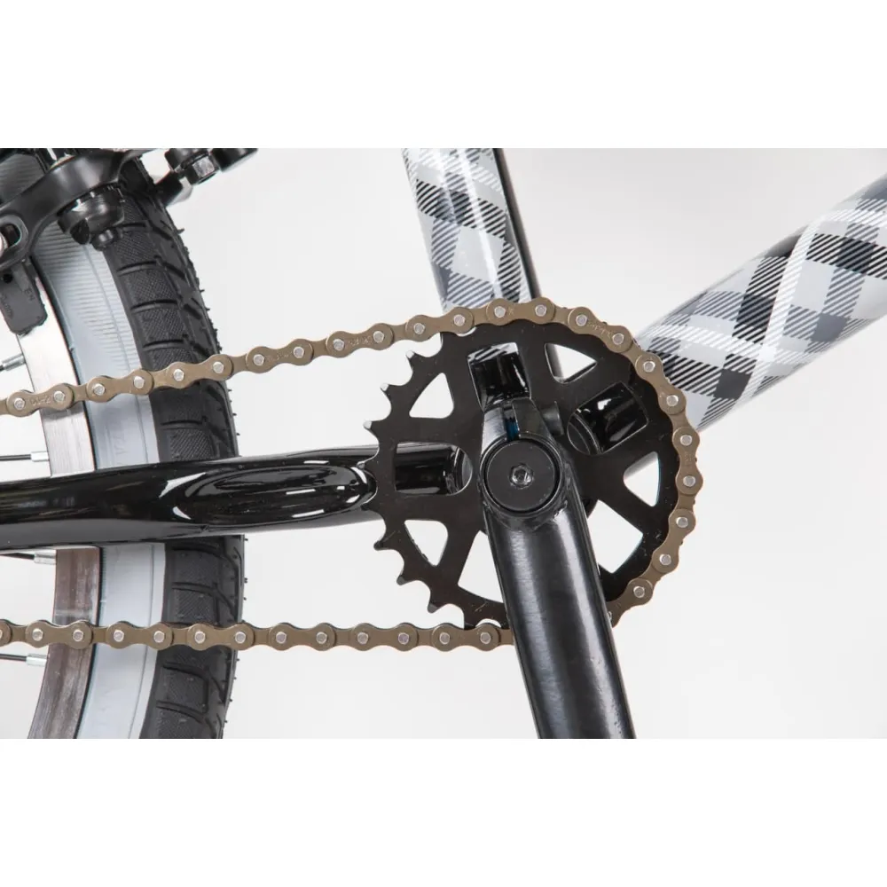 Надежная колесная часть на двойных алюминиевых ободах с накатистой резиной, брендовые покрышки, TT стальной 700 мм руль в сочетании с 4 пегами позволяют ставить трюки по рейлам и делать более серьезные манипуляции.